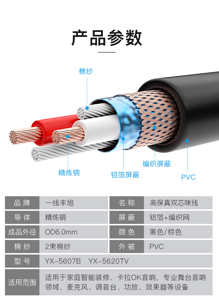 YX-5612B | OD6.0MM[(35/0.10BC+2支铜箔丝)x2C+棉纱+AL+BD(128/0.10BC)]x1F 2x0.31mm² | 米 | 100 | 打卷 |