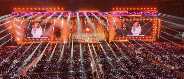 而LiGHT SKY FF42GII 纯光束摇头灯则以 “爆发力” 征服全场。200mm 超大出光口径释放出紧实饱满的光束,如同锋利的光影线条,在舞台上编织出纵横交错的光影脉络。其高速且精准的频闪功能与音乐节奏完美同步,当 A-Lin 用独特声线演绎时,频闪灯光随声波起伏,将现场情绪一次次推向高潮。更值得一提的是,该灯具支持 14 种颜色加白光的双向旋转彩虹效果,在 LED 大屏的映衬下层层叠加,为希林娜依・高的全开麦表演增添了灵动与活力,也让 Ella 的舞台魅力更具感染力,彻底拉满现场沉浸感。