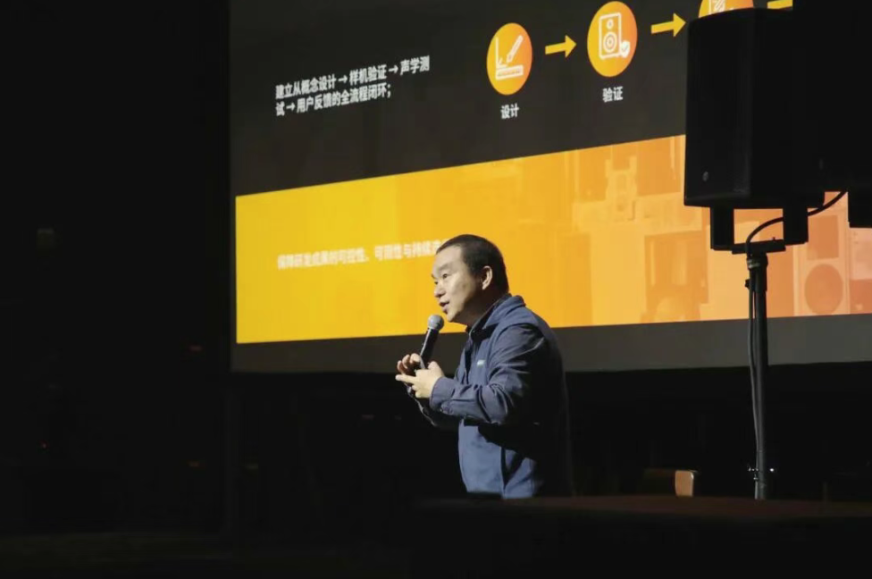 首先,张涛先生向在场嘉宾详细介绍了易科国际在东莞松山湖东部工业园区投建的研发生产基地。该基地投资5亿元,占地 30 亩,建筑面积近 10 万平方米,设有自主品牌体验中心、研发实验室、半(全)消声室、声学测评中心、模拟声场分析平台、生产制造车间,以及各种不同类型的产品检测实验场地,为研发与生产制造提供了坚实基础。易科的“技术 + 艺术”研发体系是产品的有力支撑,从概念设计、样机验证、声学测试到用户反馈全流程闭环,确保产品可控可测。
