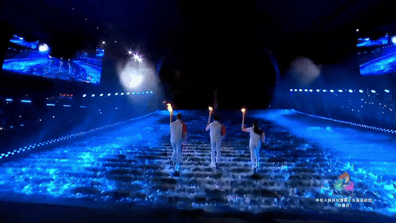 同心圆外圈光环,火炬塔瀑布台阶共应用 500 台蟠龙CL1060多功能摇头条灯。火炬点燃的高光时刻,蟠龙 尽显匠心。凭借 IP65 级防护性能,它与水型舞台完美契合,均等间距排布的灯头释放出整齐划一的光影力量。当蓝光铺满台阶、点亮浪花,火炬手逆流而上的坚毅身影被灯光勾勒得淋漓尽致;点火瞬间,灯光色彩同步蜕变,与深海圣火的升腾相映成趣,将 “龙腾伶仃洋” 的豪情与 “天海一心” 的愿景推向高潮。这款兼具 10x60W RGBW 光源与 240*2 冷暖频闪功能的产品,以 4.5°-36° 灵活变焦与独立 Y 轴控制,为盛典打造了兼具科技感与诗意的光影叙事。