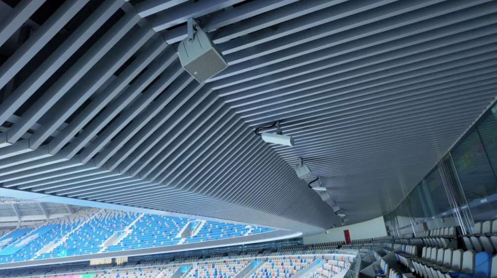 针对体育场户外半开放环境、观众区跨度大的特点,易科在场地马道上方安装 252 只 EAW KF210 线阵列扬声器,分区域覆盖观众区与比赛场地,确保全场声场均匀。
