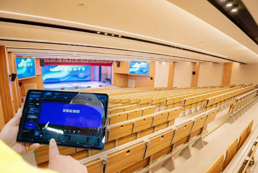 此外,明和还可为客户定制扩声系统、视频远程系统、无纸化会议系统……以上所有系统,一个平板即可轻松搞定。大屏开合、音量调节、灯光亮度控制,甚至无纸化终端的开关机、一键升降,不需要复杂的操作,即使是小白也能迅速上手,轻松驾驭每一个场景。