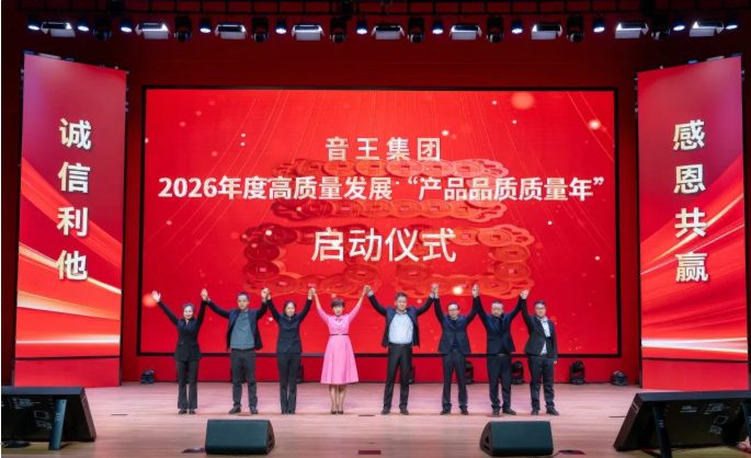 2026年,音王集团正式将“品质年”的战略目标升华为全员行动纲领。在集团2026年度高质量发展“产品品质质量年”启动仪式上,执行总裁陈众与生产运营中心、品质管理部、电声制造部、来料检验部等部门负责人共同登台。在全体参会人员的瞩目下,现场响起激动人心的倒计时声,随后众人一齐按下象征品质承诺的启动按钮。从这一刻起,仪式的震撼将转化为日后每一天的坚实步履——2026,品质为王,使命必达!