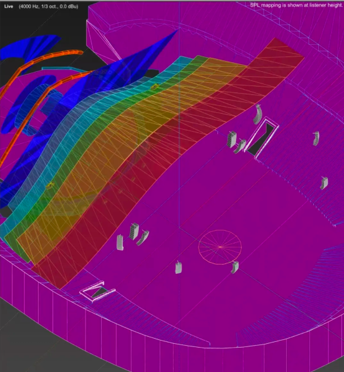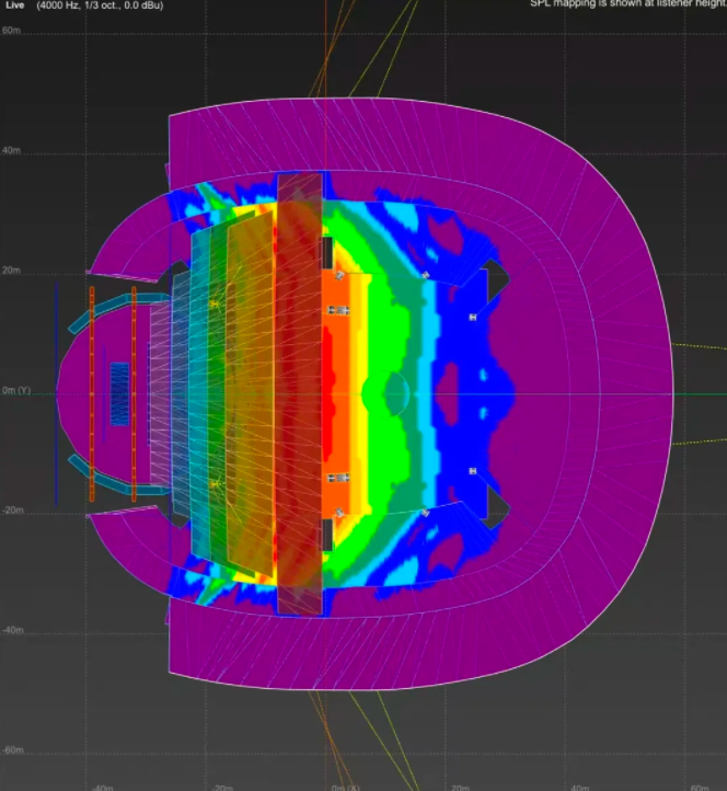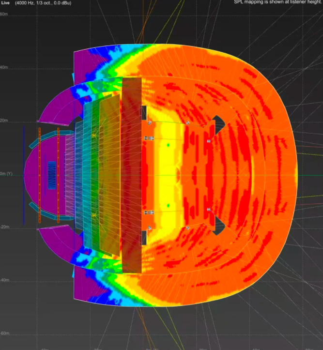 针对场馆声学短板,团队不仅引入d&b专利的ArrayProcessing(AP)线阵列声场再优化技术,对延伸舞台及主舞台区域进行精准声能控制,避让拾音干扰;更以分区域设计思路布置delay线阵列音箱,确保从内场前排到看台三层的每一个座位,都能获得一致的清晰听感。