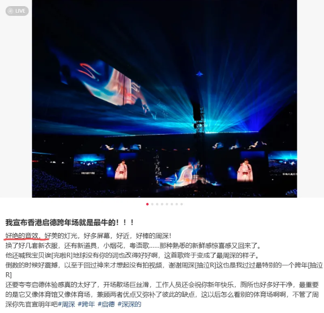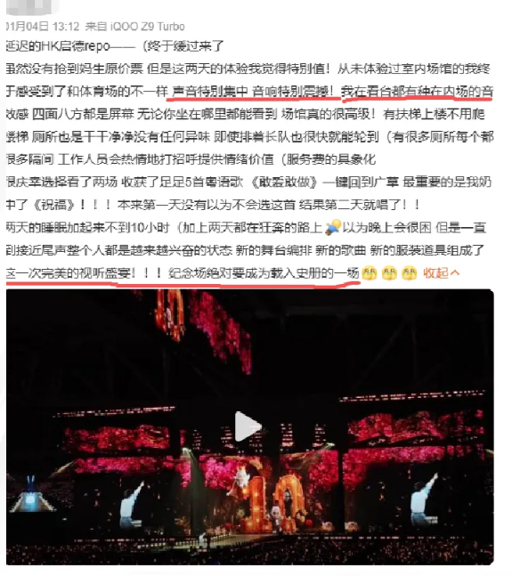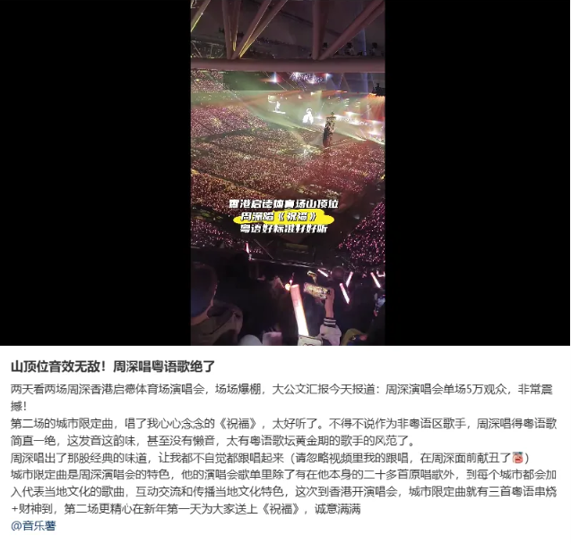 数万观众的狂欢与盛赞,是这场演出最真实的注脚。社交平台上,歌迷字里行间满是惊喜,“听觉盛宴”成为评价中的高频关键词。不少观众直言周深的现场表现远超红馆水准,即便身处远离舞台的“山顶位”,也能享受到堪比内场的音效体验,音质清晰通透,丝毫没有距离带来的衰减感。更有香港本地歌迷盛赞“启德这个音效绝了,简直绚烂无比”,这份认可不仅属于周深的深情演绎,更离不开幕后团队的专业加持,让启德体育园的声场潜力被完美激发。