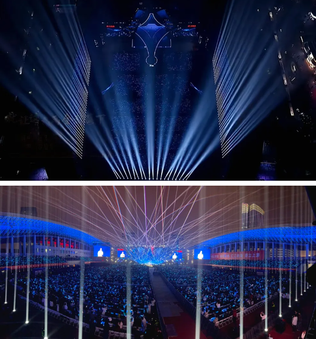 作为本次光效呈现的核心力量,LiGHT SKY全防护IP520光束灯的硬核性能在晚会中尽数彰显。其高照度与远投射优势,精准勾勒出舞台的空间层级,让折形翅膀结构的包容之势、熊猫与酒樽等文化符号的细节美感清晰呈现;快速响应的光效切换能力,完美适配晚会三大篇章的节奏变化,在不同节目段落中灵活调整光影形态,时而叠加棱镜效果形成交错有序的光结构,时而聚焦视觉焦点强化表演张力,让长江文化的叙事与酒都风韵的展现更具感染力。