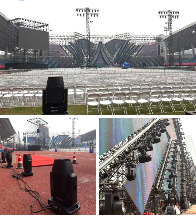 在宜宾市体育中心露天顶部与大纵深的复杂场地条件下,LiGHT SKY全防护IP520光束灯展现出超凡的环境适应能力与性能稳定性。灯具以舞台核心结构为原点纵深铺陈,沿体育馆环形空间同步延展布置,巧妙构建起舞台与观众席的光影联动,让现场氛围从舞台呈现自然升级为全场沉浸式体验。面对露天环境的诸多挑战,该灯具凭借IP66级全防护性能,从容应对各种复杂工况,始终保持稳定输出,为晚会的顺利录制与播出提供了坚实保障。