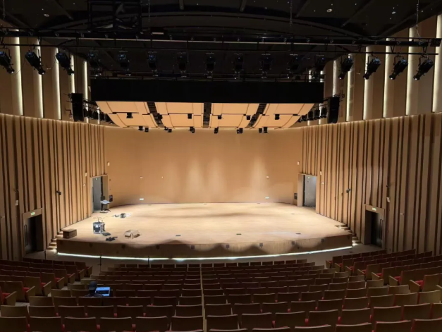 主扩由舞台两侧吊挂的Kiva II组成,黑色的箱体隐匿于黑暗中,与舞台融为一体。这种布局旨在为观众提供宽广而均匀的声音,同时还能不破坏建筑的设计风格。前补采用的是5XT。音乐厅的5XT同样采用嵌入舞台的形式,其主要负责填补近场声能,确保前排观众能获得细节清晰的听感。