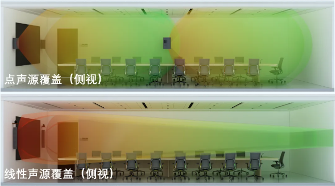 传统点声源音箱的声波呈球面扩散,易在墙面、天花等界面产生反射,导致直返比下降;柱式扬声器虽凭借较窄的垂直扩散角,能一定程度减少顶面反射,却难以规避后墙反射带来的干扰,仍存在声学短板。
