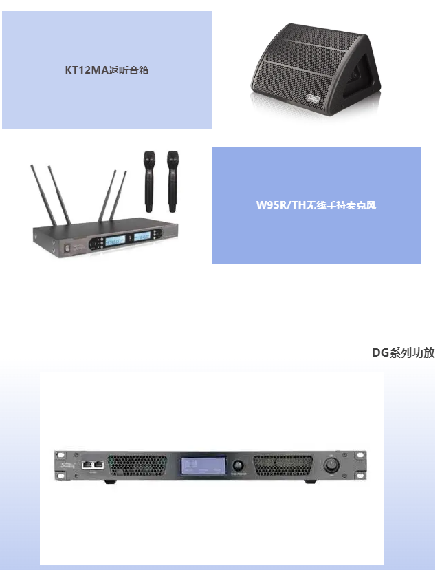 此外,系统还搭配音王KT12MA返听音箱与W95R/TH无线手持麦克风,补齐场景适配短板。KT12MA返听音箱外形小巧紧凑,45°、20°可选角度设计,适配临时扩声与舞台监听等多种场景;W95R/TH无线手持麦克风采用UHF双通道自动选讯技术,有效规避环境干扰,确保语音传达清晰、稳定,完美适配赛事解说、领导讲话、文艺表演等各类语音传输需求。