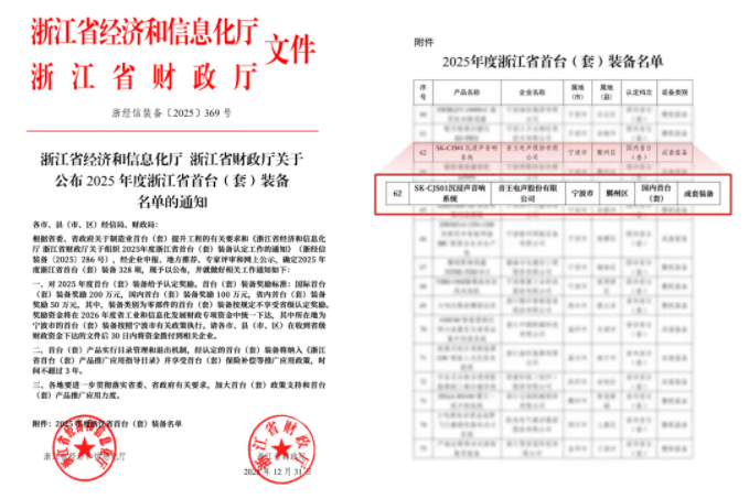 近日,浙江省经济和信息化厅、浙江省财政厅联合公布 2025 年度浙江省首台(套)装备名单,音王集团旗下 SK-CJS01 沉浸声音响系统凭借领先的创新技术与产品实力,成功获评 “国内首台(套)” 装备认定,成为 2026 年国内音频装备领域首个获省级权威认定的 “国内首台(套)” 产品。此次认定不仅是对音王技术研发成果的高度认可,更彰显了浙江制造业在音频装备领域的创新硬实力。