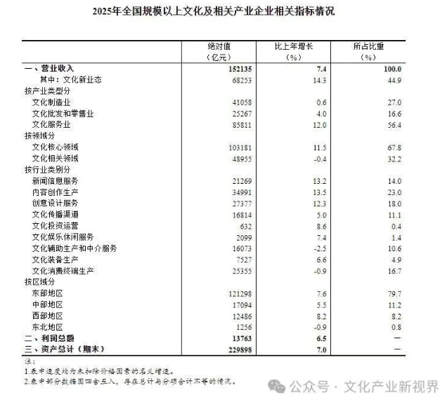 国家统计局发布消息:据对全国8.2万家规模以上文化及相关产业企业(以下简称“文化企业”)调查,2025年,文化企业实现营业收入152135亿元,按可比口径计算(详见附注2),比上年增长7.4%[1]。其中,文化新业态特征较为明显的16个行业小类[2]实现营业收入68253亿元,比上年增长14.3%,快于全部规模以上文化企业6.9个百分点。